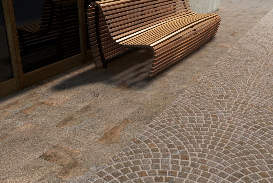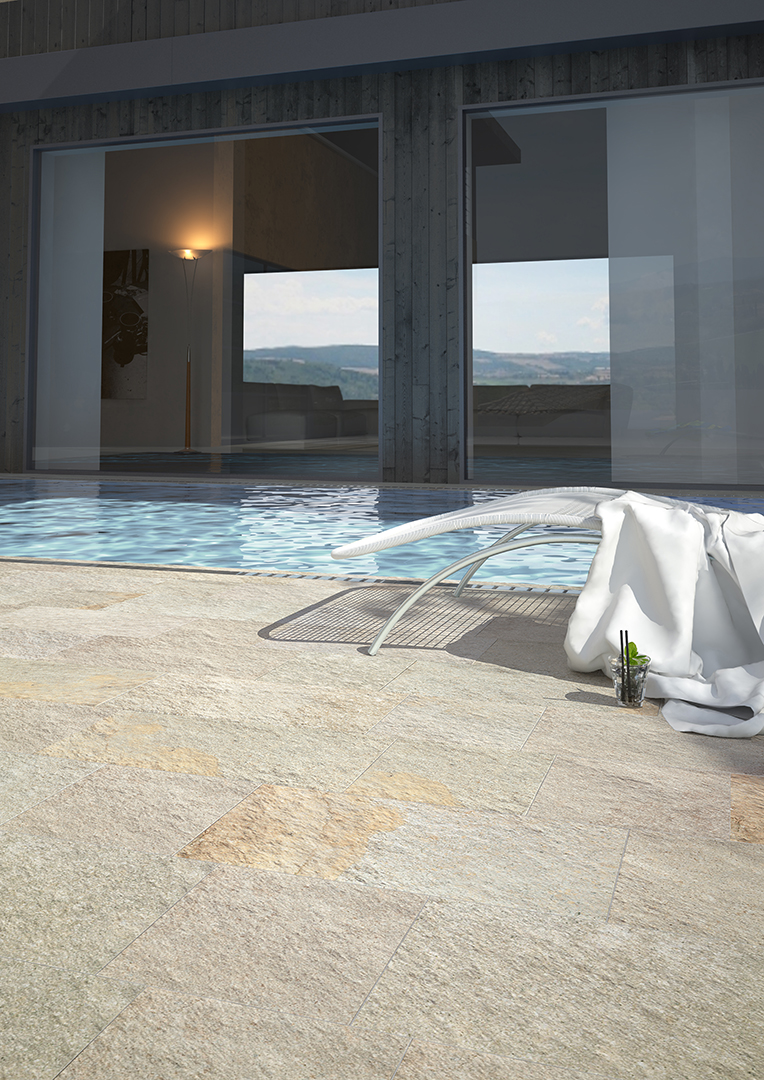 Le porphyre céramique est le protagoniste des solutions articulées pour l’extérieur.