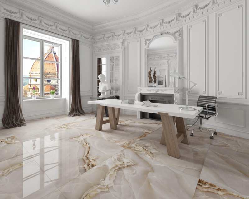 Carreau délicat aspect marbre avec finition polie, format 120×120 cm ; son intense couleur café parcourue de veines inondera de luminosité et de sophistication n’importe quelle pièce.