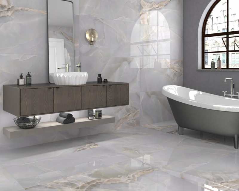 Carreau délicat aspect marbre avec finition polie, format 60×120 cm ; sa douce couleur bleu-gris parcourue de veines inondera de luminosité et de sophistication n’importe quelle pièce.
