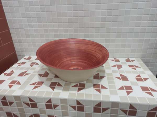 Lavabo, en rouge victorien, conçu pour compléter la série Mintons. Ces pièces sont entièrement réalisées à la main. Sa forme ovale irrégulière offre un aspect extérieur proche de celui de la porcelaine brute.