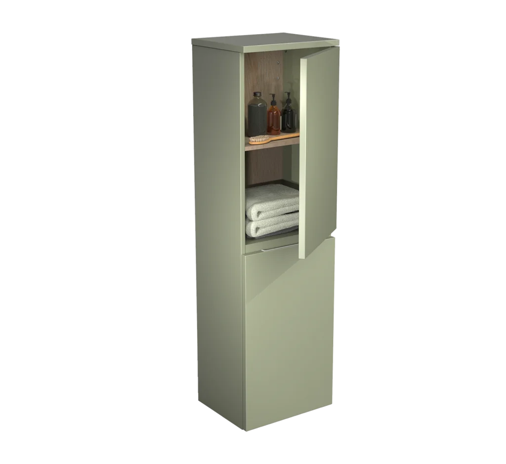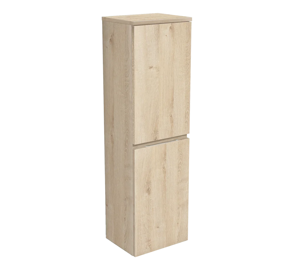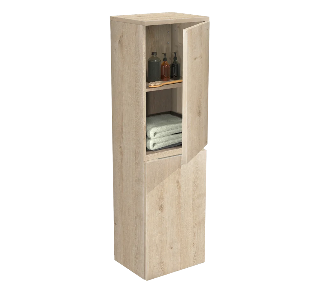 La demi-colonne Égoïste avec 2 portes charnières à droite et à gauche créée par DECOTEC est proposée avec 2 tablettes réglables mélaminées décor Chêne gris patiné