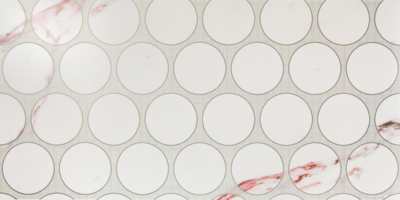 Carreau décoré qui imite le papier peint. Son design se distingue par des cercles corrélatifs qui se fondent avec la base du marbre et des veines rubis. Il est parfait pour une utilisation dans des projets contemporains.