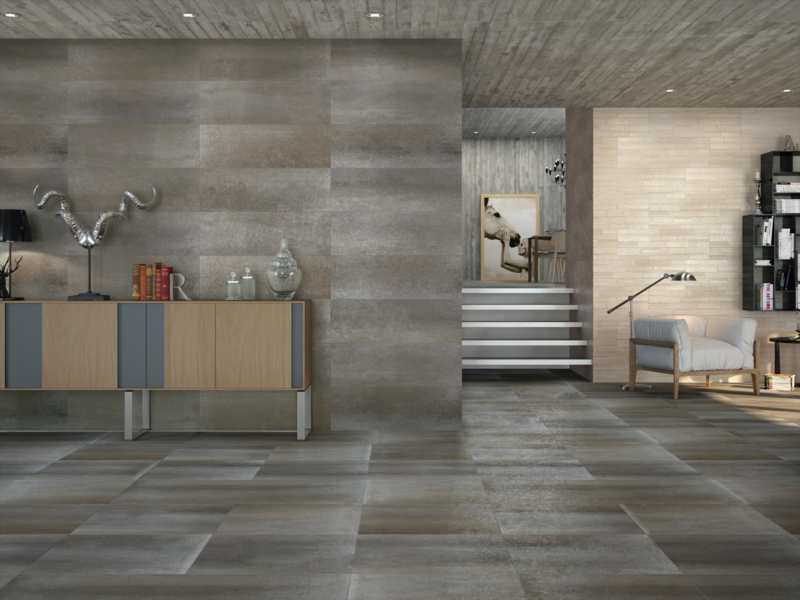 Carrelage rectifié moderne et original de 30×90 à la texture de plaque métallique. Ton gris avec des nuances d’oxyde.