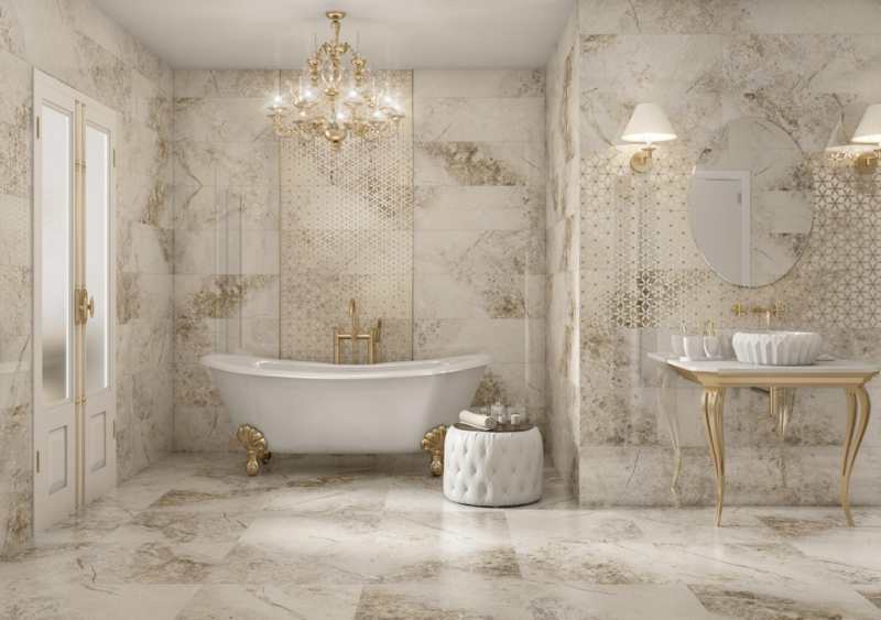 Carrelage décoratif élégant effet marbre, 30×90 cm, dont la couleur crème est parcourue de délicates veines café, avec un motif géométrique sans fin inspiré par la fleur de vie et réalisé à base de riches matières dorées.